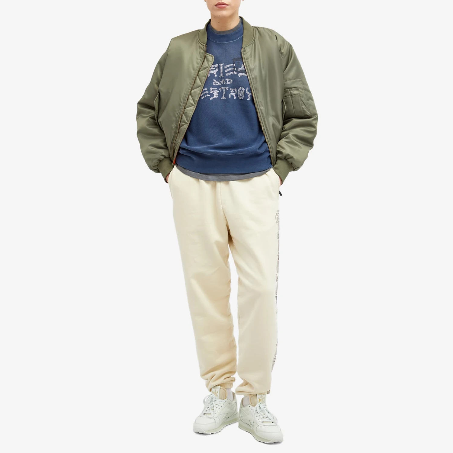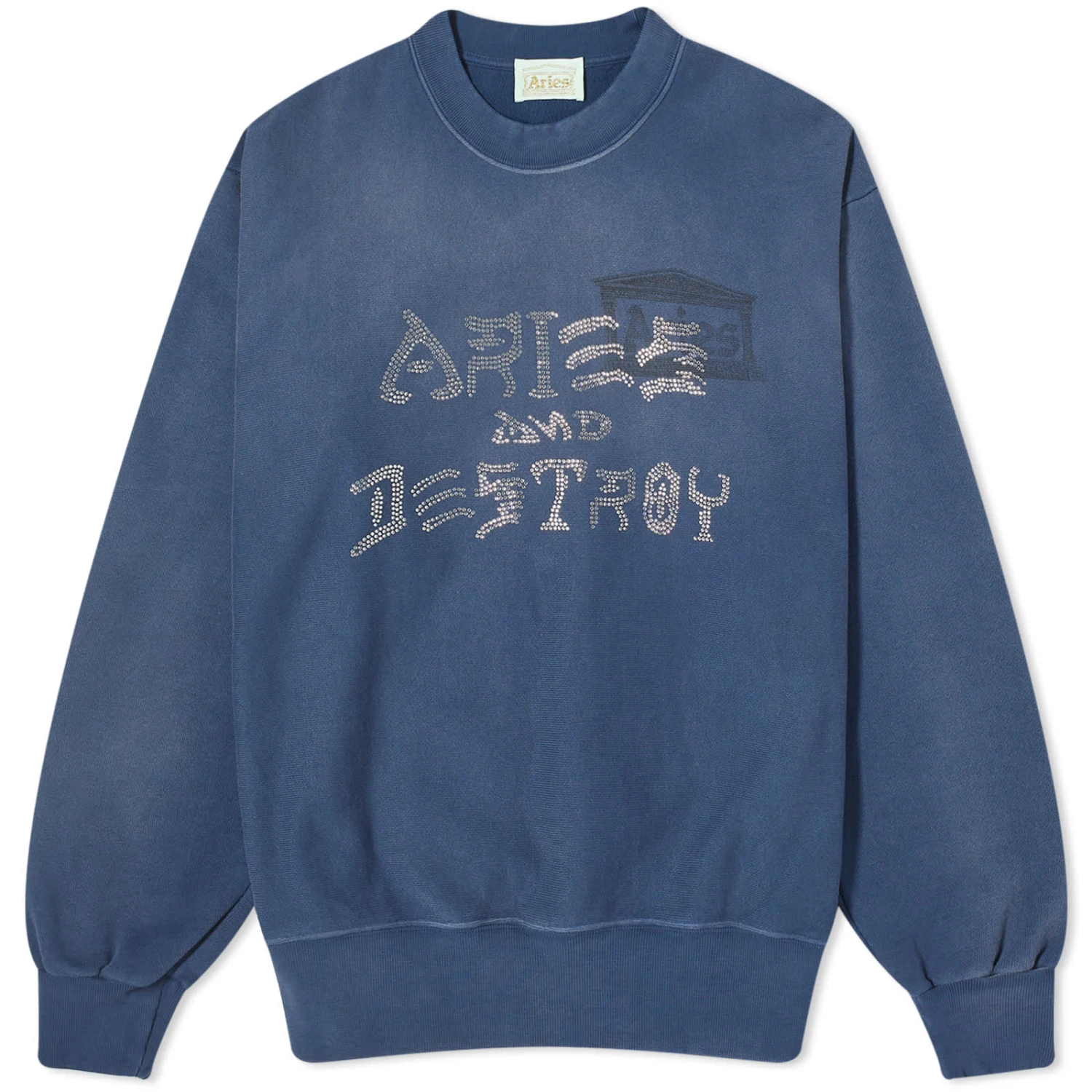 Aries latest crew neck sweatshirt is all kinds of comfy, thanks to its brushed-back cotton jersey fleece and those rib panel details on the sides. Look closely and you’ll spot the Ancient Aries Temple logo, but with a twist. It’s been given a ‘destroyed’ look through a heavy wash and then jazzed up with some sparkly diamantes that read ‘Aries and Destroyed’.