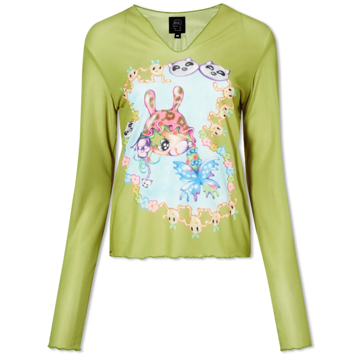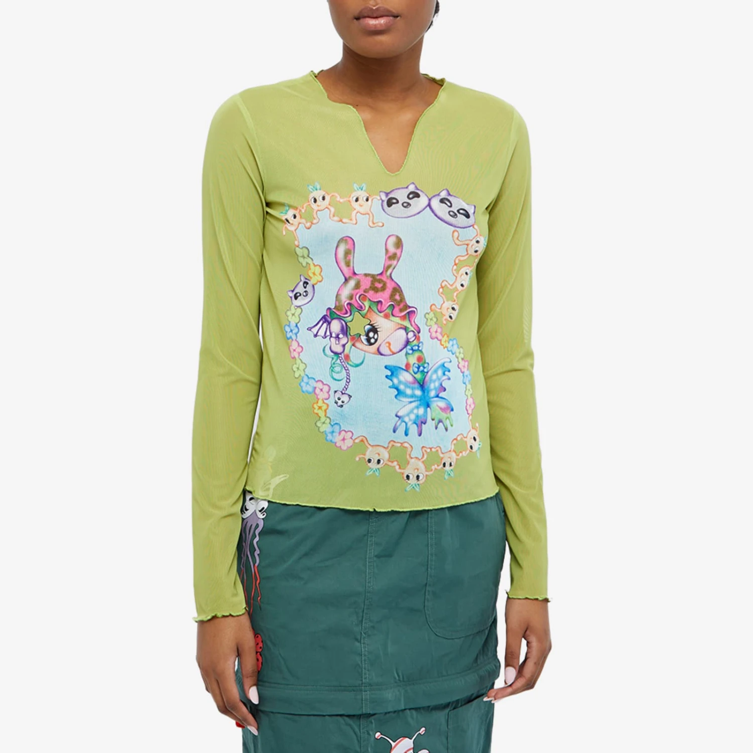 Through her artwork, Ema Gaspar aims to explore her inner-self and develop an “atmosphere of memory” with her imagery – themes continued with Ema’s collaboration with creative collective Brain Dead this season. Detailed with her signature “disconnected elements”, this mesh top is a playful and thoughtfully bold addition to see you through the seasons.