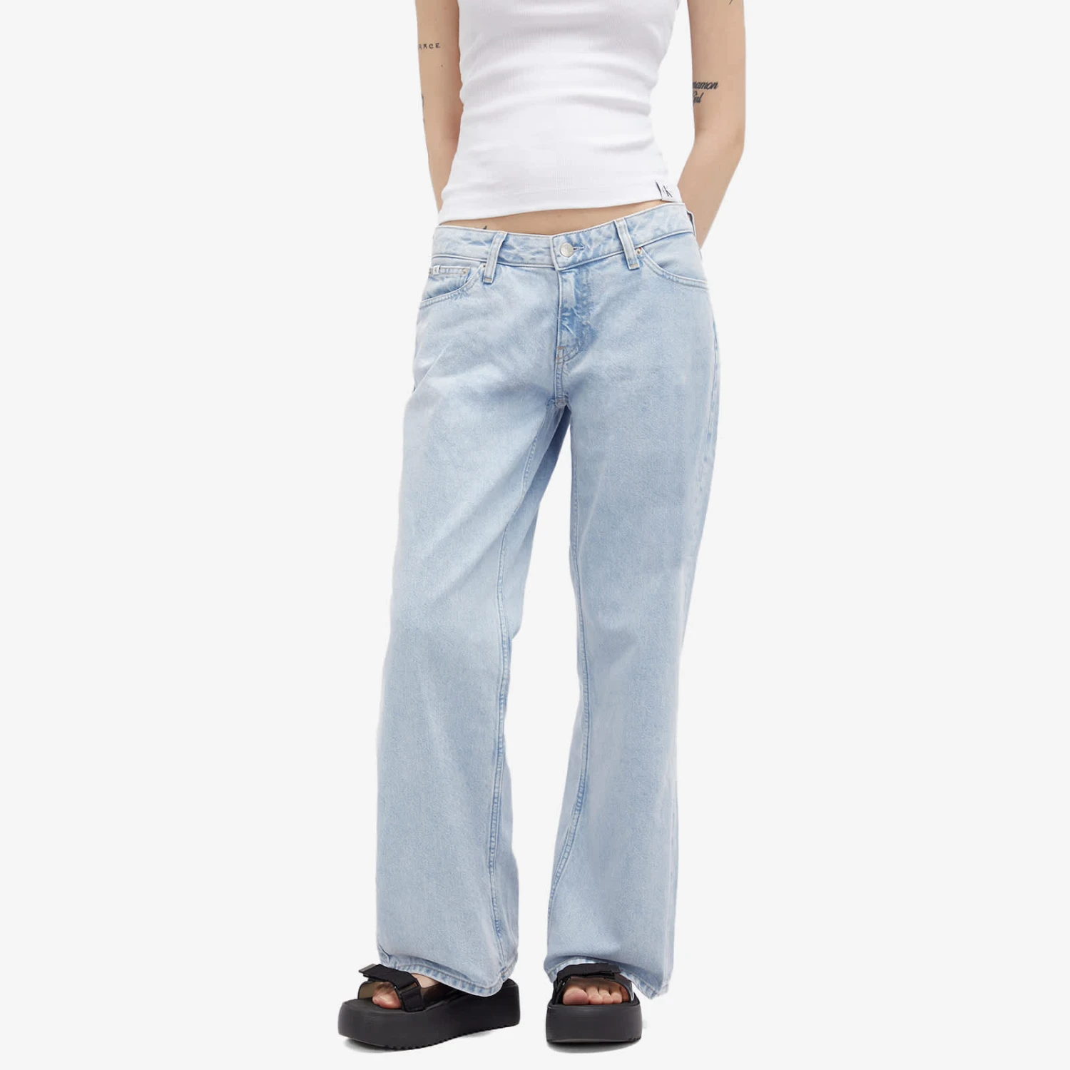 Embrace effortless 90s-inspired chic with these tapered, relaxed fit jeans from Calvin Klein. Crafted with a very low rise and multiple pocket styling, these jeans promise both style and comfort. Perfect for casual outings or a trendy night out, the leather brand patch on the back waistband adds a touch of luxe to your look.