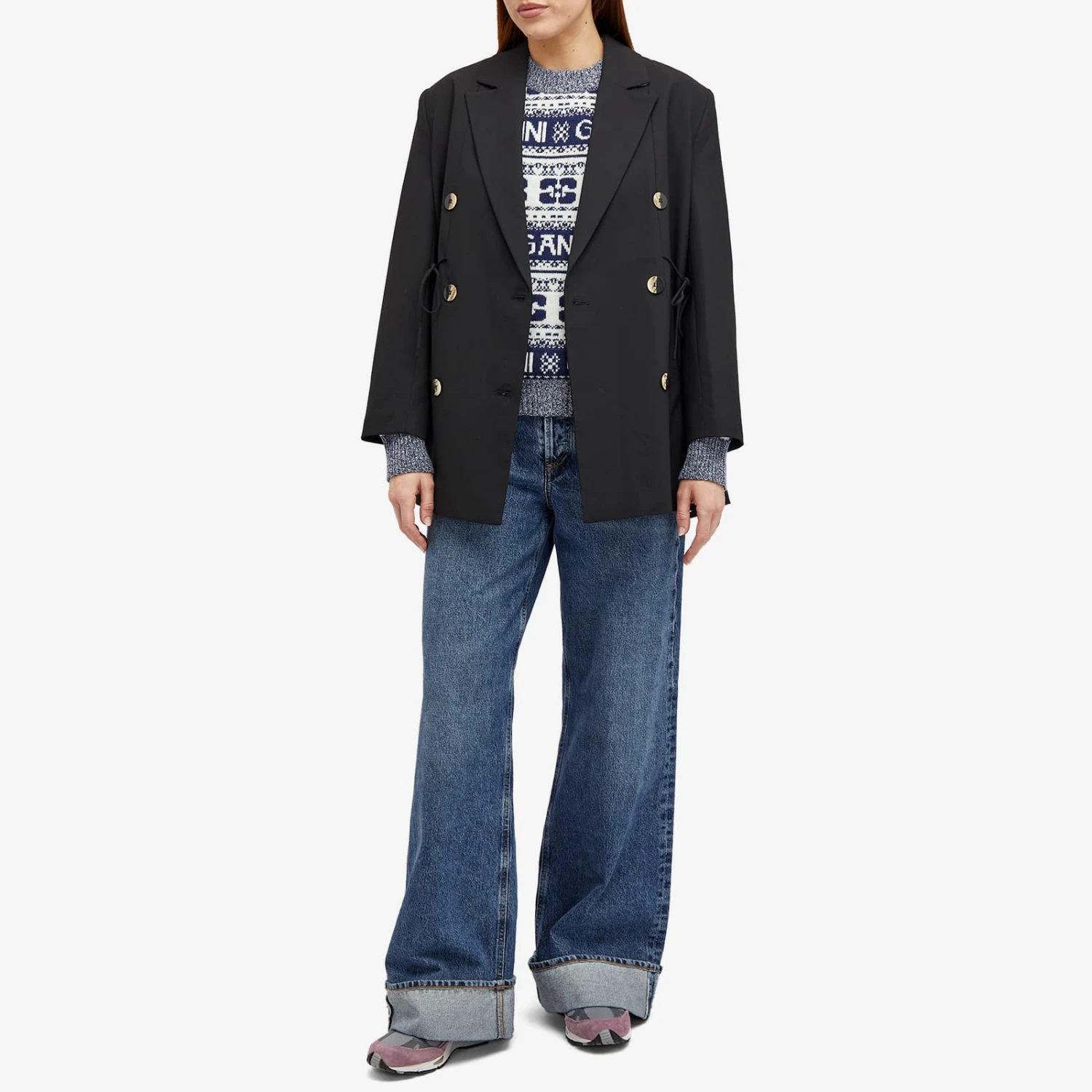 Scandi brand GANNI is a master in the art of joy-inducing knitwear. Fun patterns? Got them! A riot of colours? Absolutely! This season, the retro-cool butterfly logo swoops and swirls across this jumper, creating stripes amidst jacquard branding. Crafted from a recycled wool blend, it’s got chunky, marbled ribbing at the cuffs and hem to add a dash more playfulness.