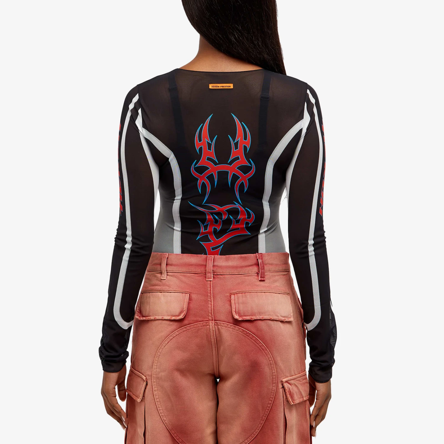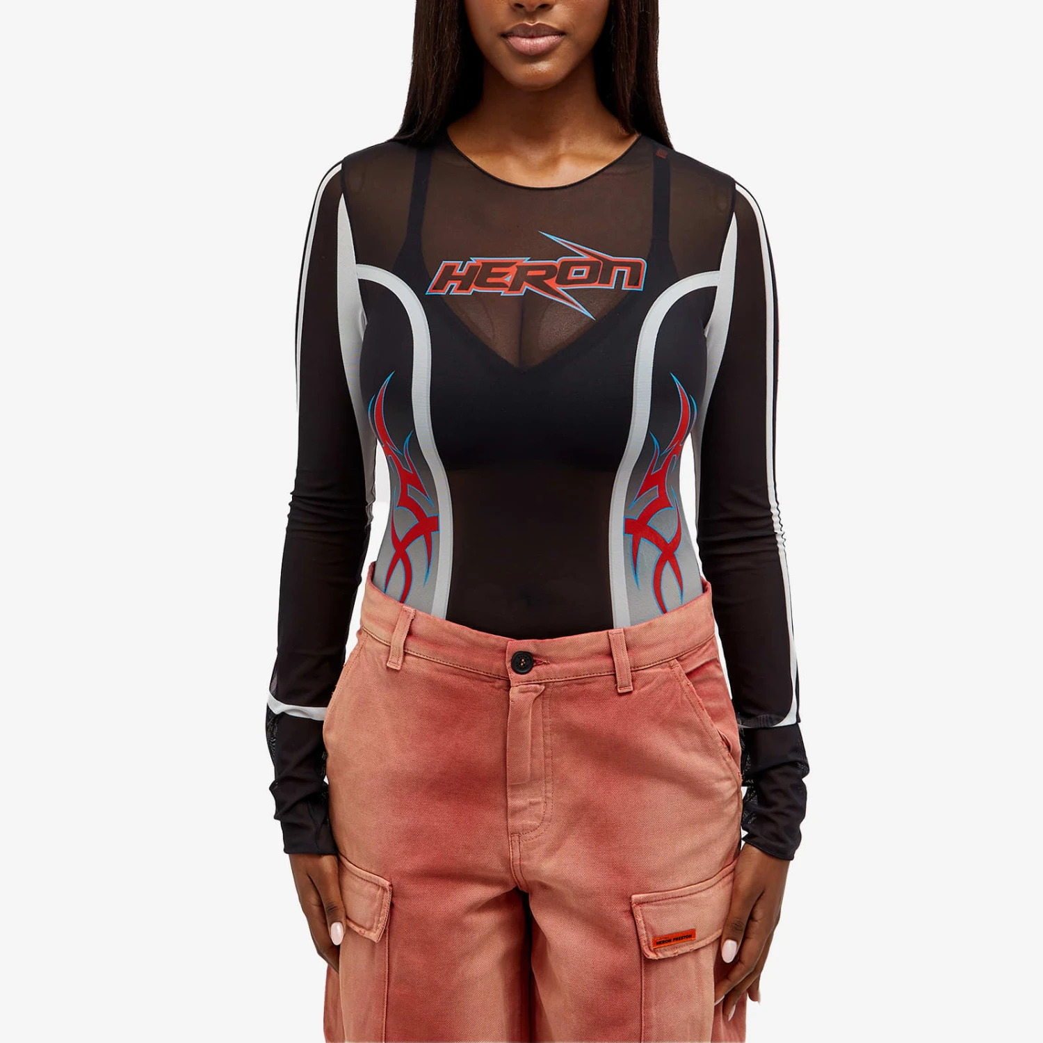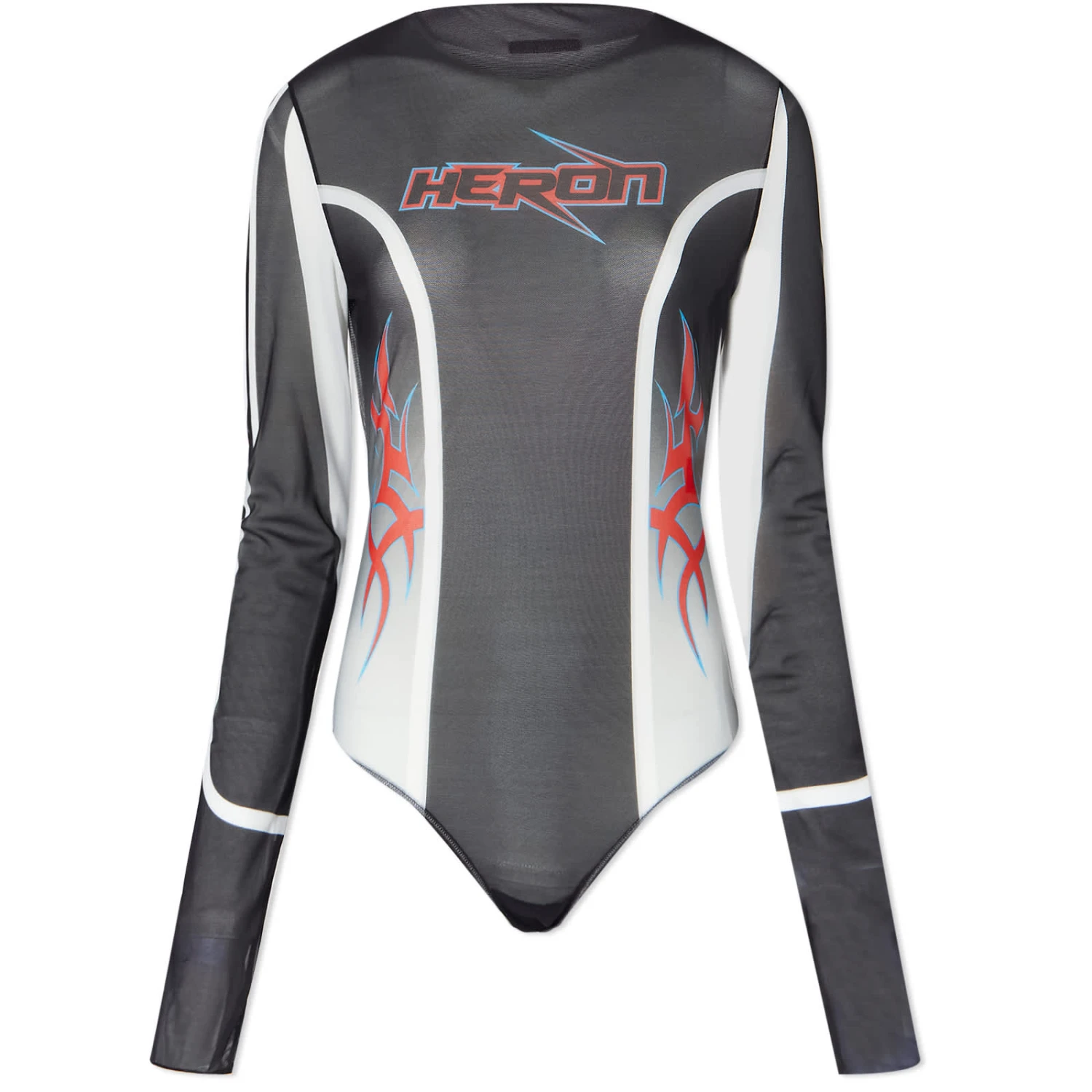 An icon of the streetwear scene, each Heron Preston collection draws from a range of electric influences to create its unmistakable aesthetic. Inspired by racewear, this mesh bodysuit features an array of striking, lightning inspired graphics and logos. Imbued with a gothic sense of style it features a semi-sheer construction.