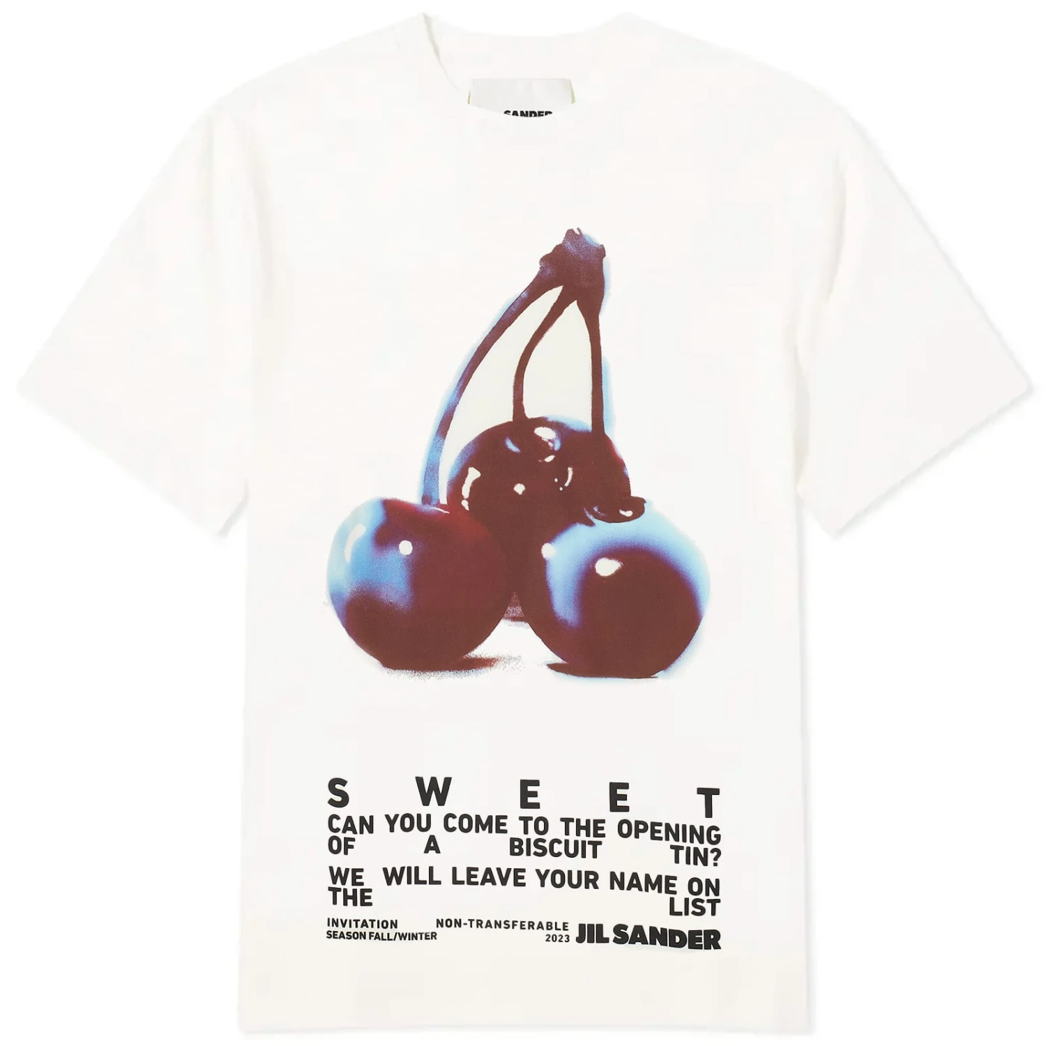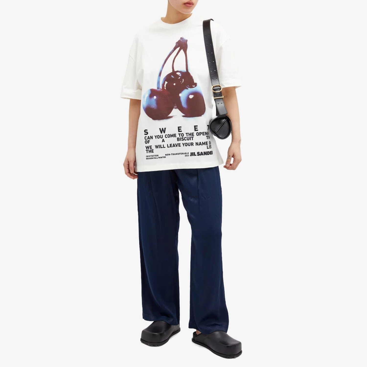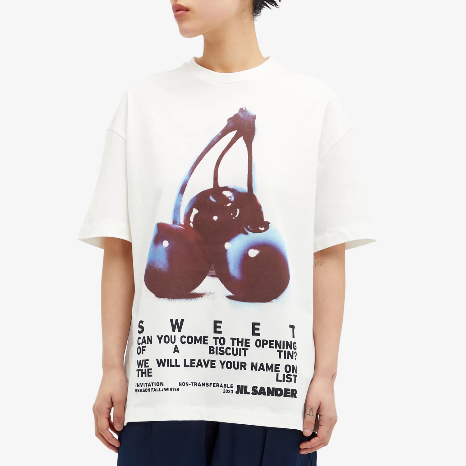 Jil Sander, established by the eponymous German designer known as the ‘Queen of Less’, has been lining wardrobes with minimalist luxury since 1968. This beige short sleeve Cherry T-shirt marks an exciting divergence from the classics with its bold graphic design. Front and centre sits a vibrant cherry graphic, underlined with bold, quirky lettering and statement branding which invites the wearer to welcome some sweetness into the Fall / Winter season.