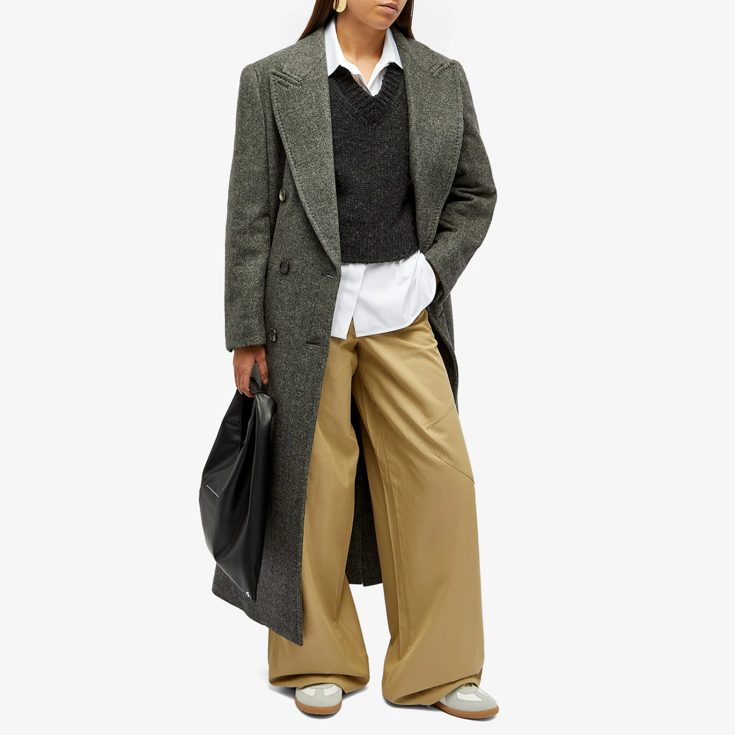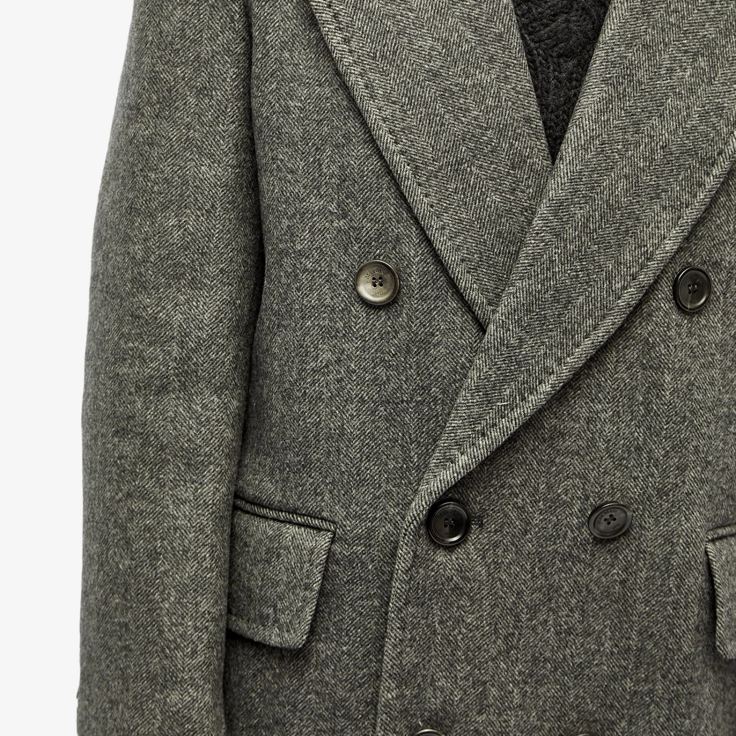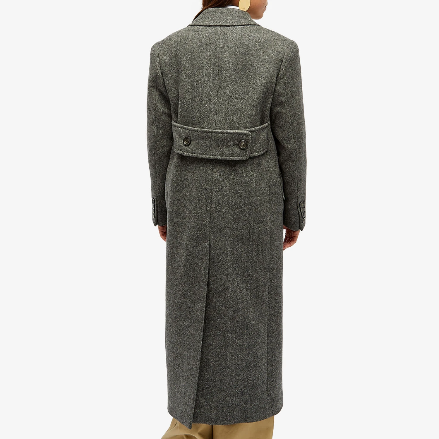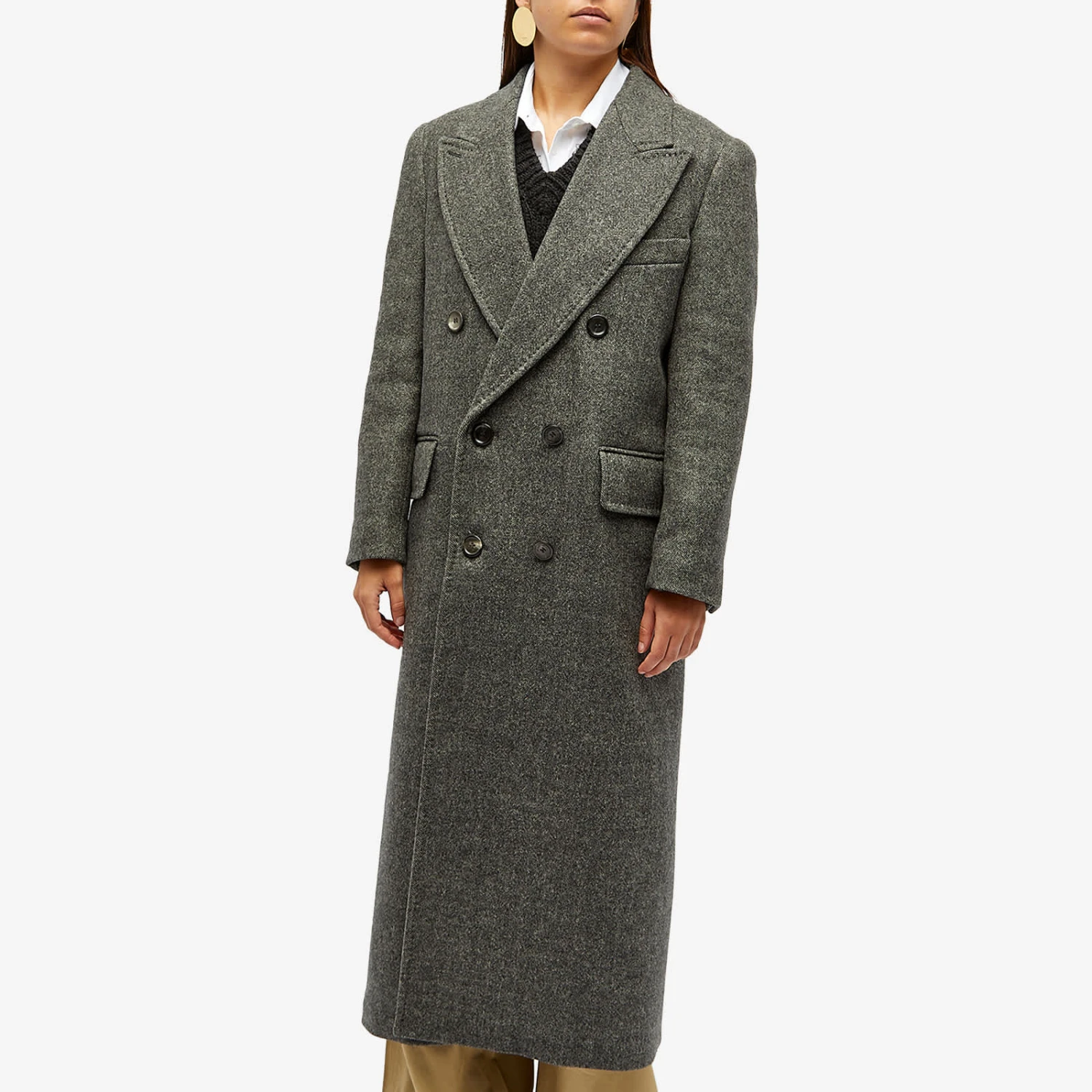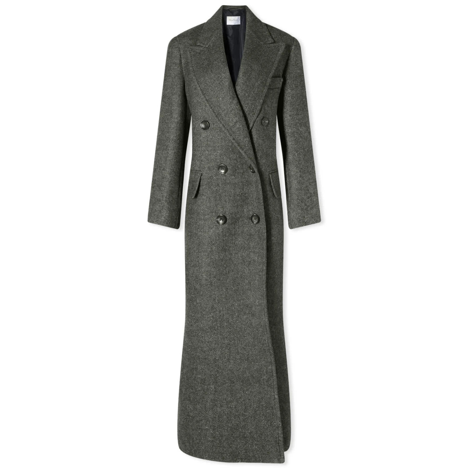Max Mara initially shot to fame for redesigning the traditionally masculine longline coat with feminine flair – a legacy that now continues with this dark grey variation, straight from the runway. This slightly oversized silhouette is structured with defined shoulders and peak lapels, while a classic chevron pattern details throughout.