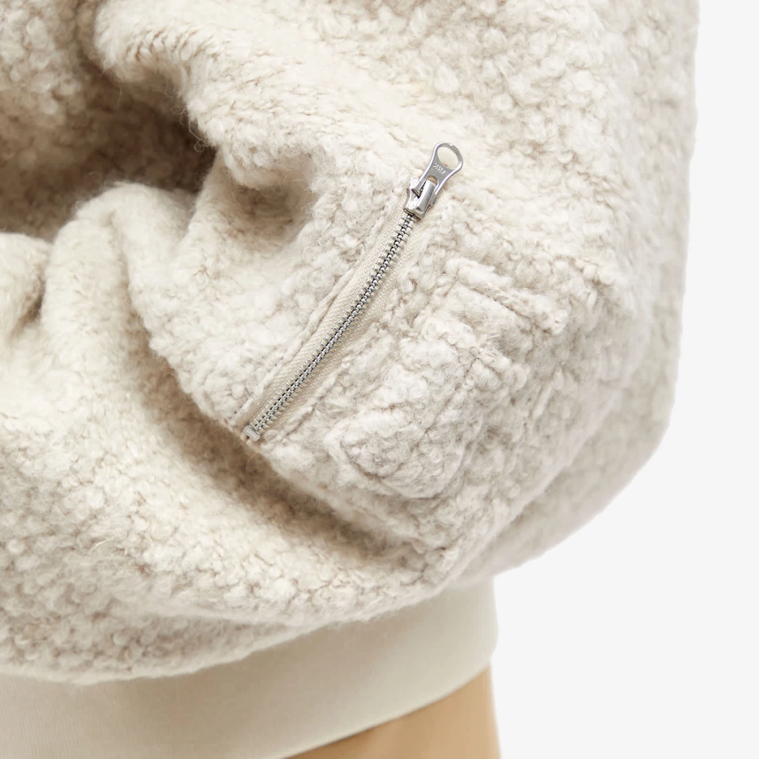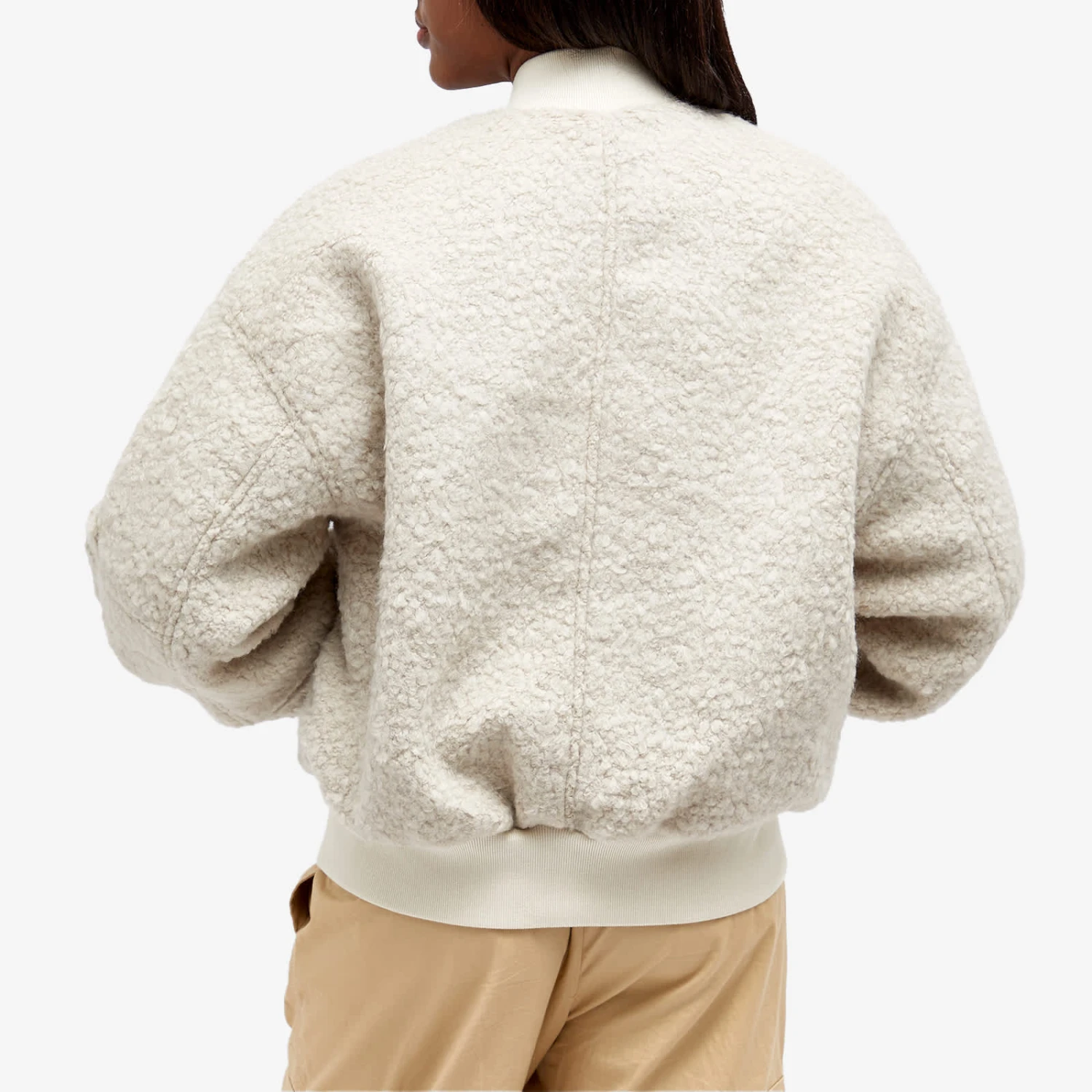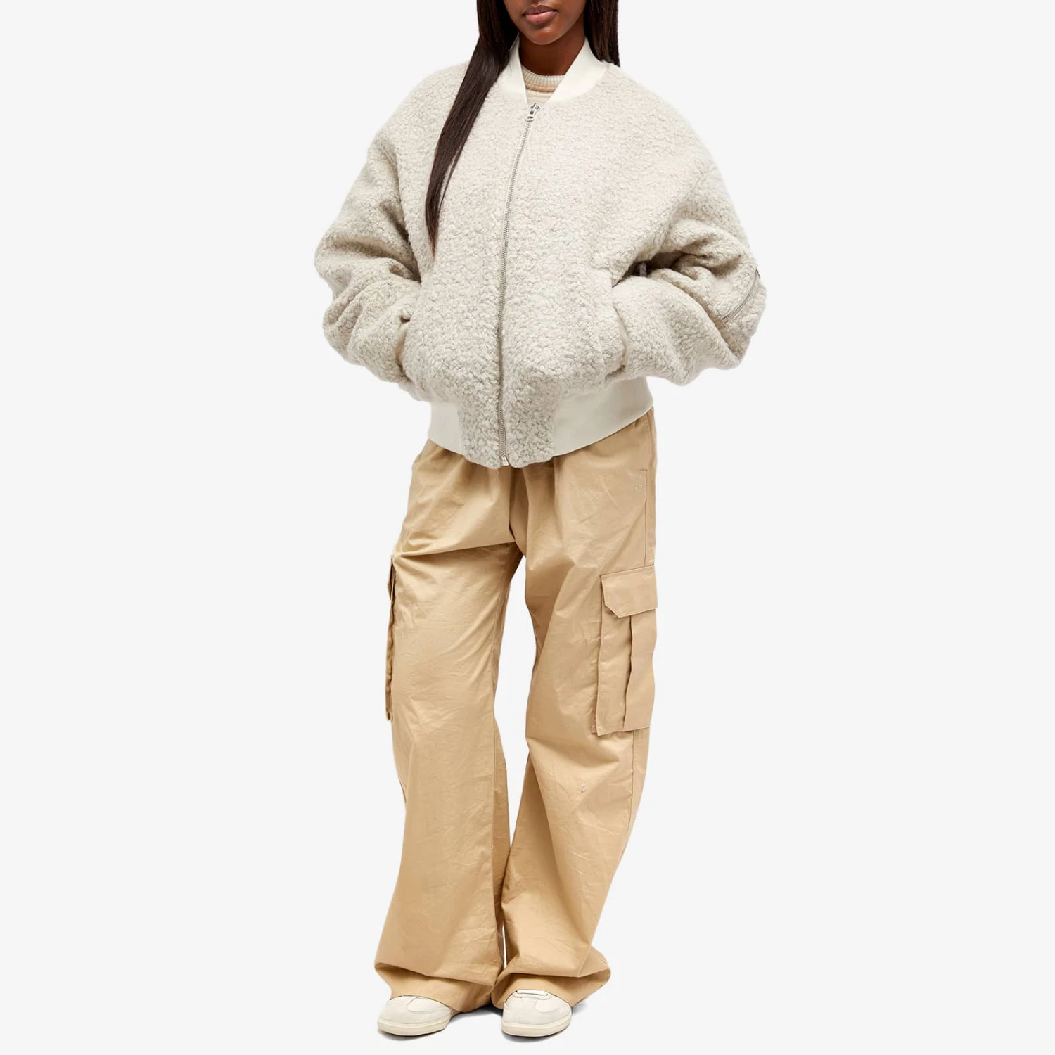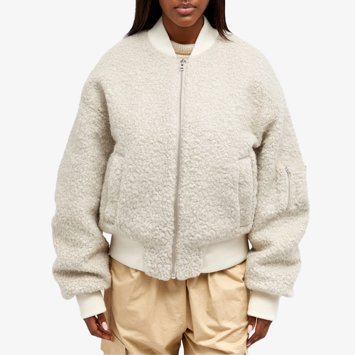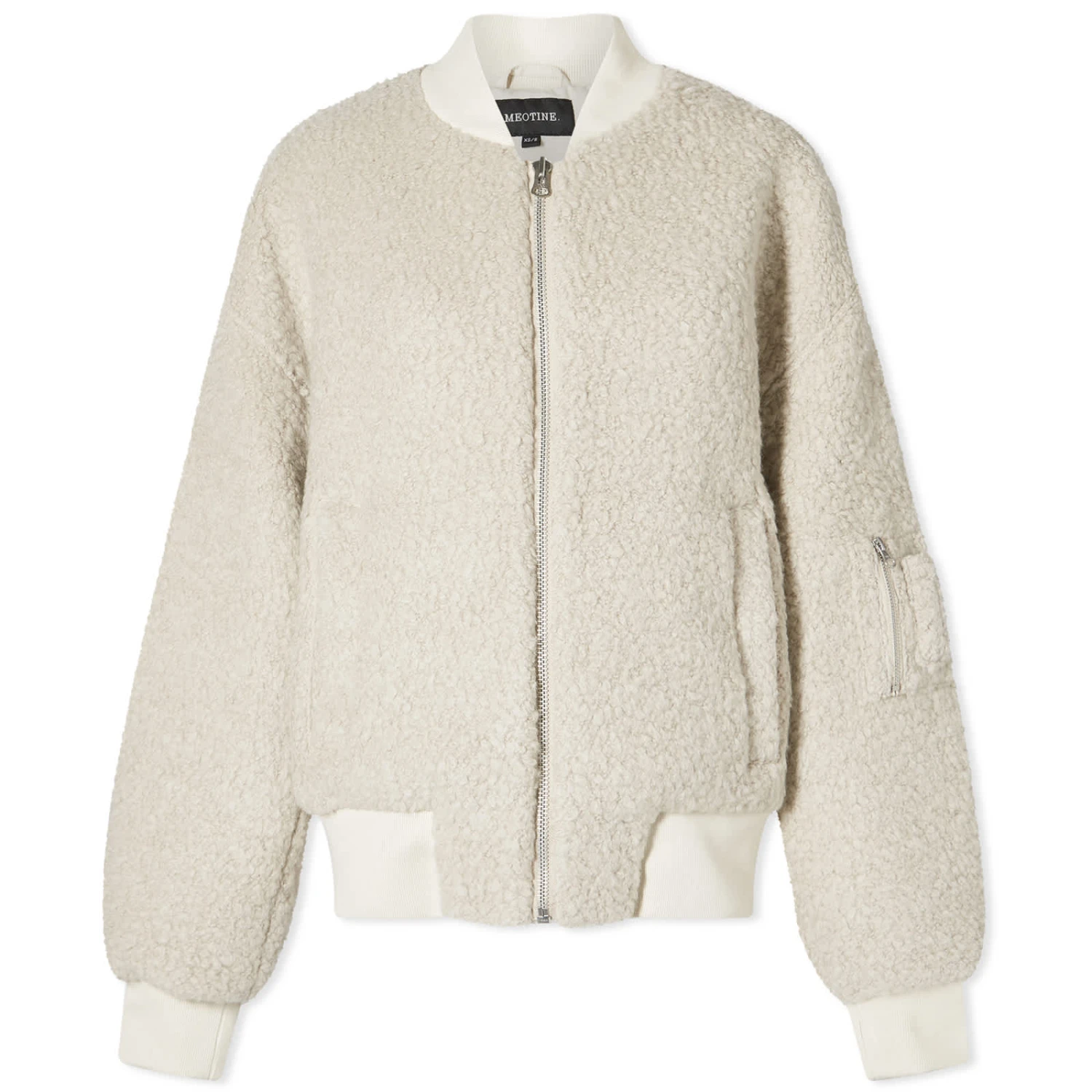 Meotine transforms quiet luxury with a military-infused edge thanks to this Bianca wool boucle jacket. Here, the classic bomber jacket is reimagined using luxurious wool boucle fabric, cut to an oversized fit and decorated with silver-tone hardware – ensuring the perfect balance of fashion and functionality.