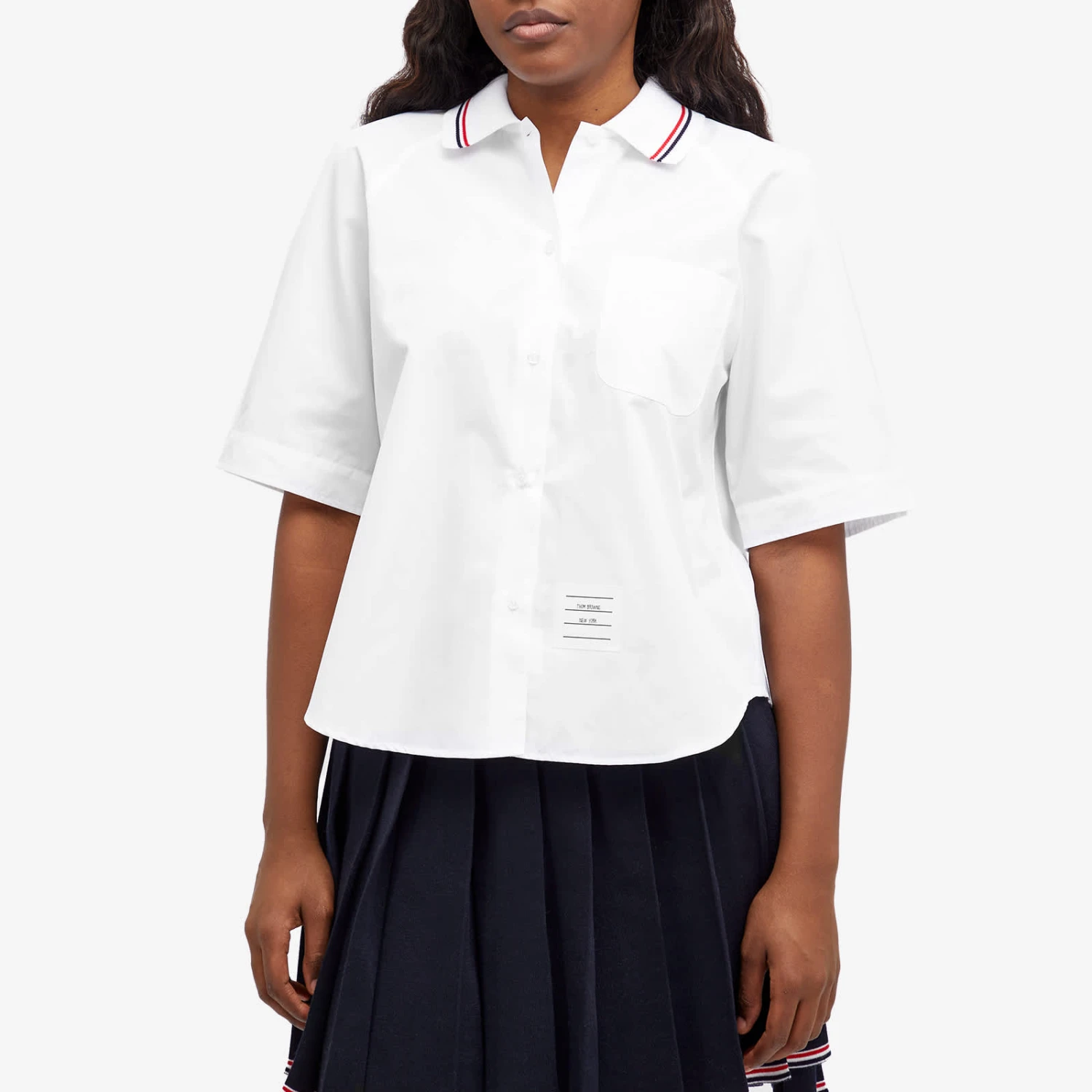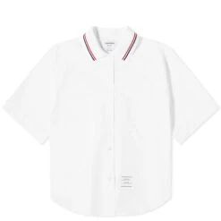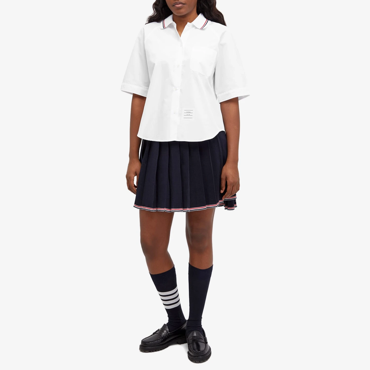 Thom Browne continues to epitomise its traditional tailoring with this Box Pleat Rib Short Sleeve Shirt. Here, a comfortable dropped shoulder cut is accompanied by a clean-cut pointed flat collar – where the New York label’s signature tri-colour palette decorates around the neck. What’s not to love?